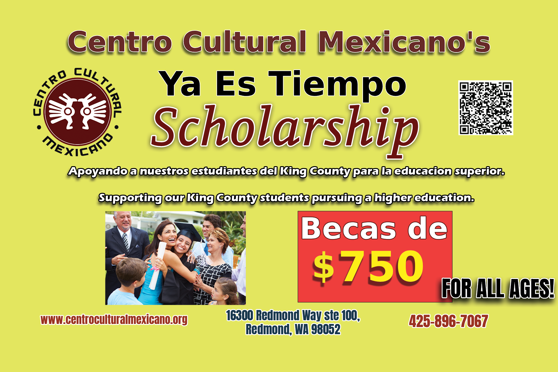 Con la Beca del Centro Cultural Mexicano Ya Es Tiempo, el Centro Cultural Mexicano brinda la oportunidad a los estudiantes de ascendencia latina de obtener una educación postsecundaria. Esta beca es para ayudar con cualquier gasto que pueda experimentar un estudiante.